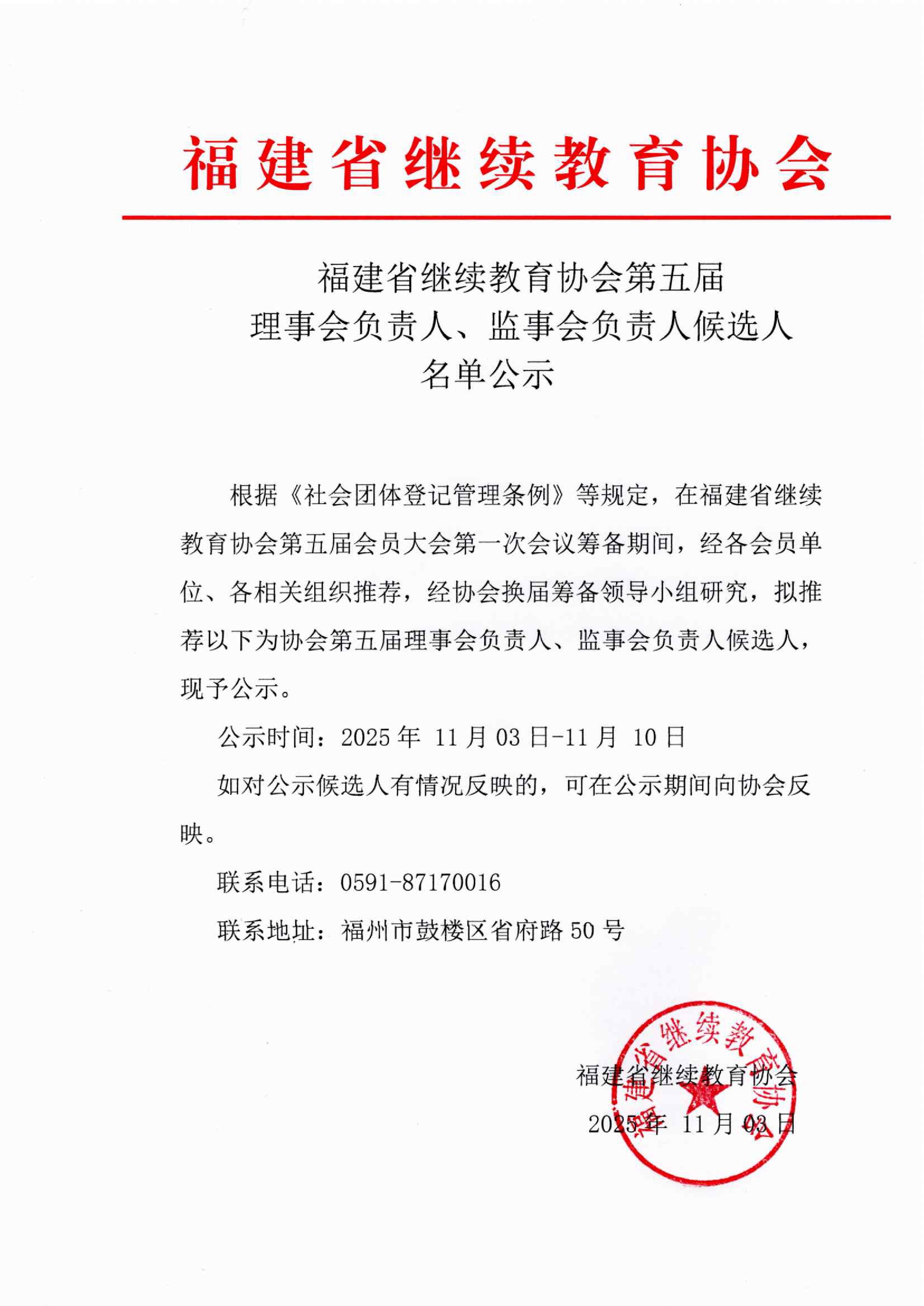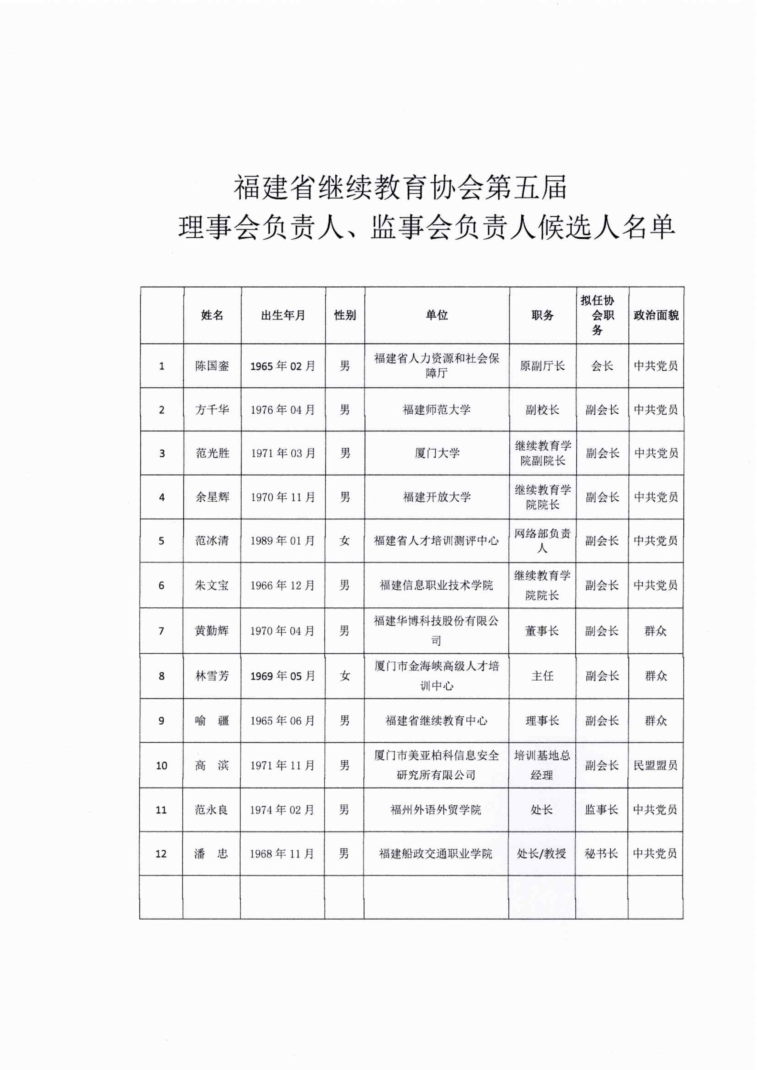 福建省继续教育协会第五届 理事会负责人、监事会负责人候选人名单公示